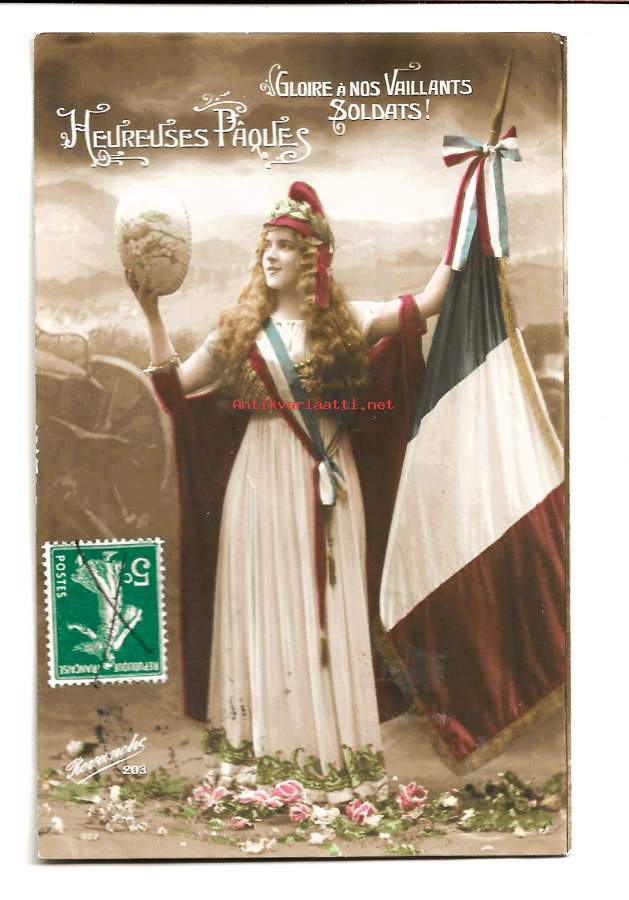 Propagandakortti, sotilaspostikortti, lippupostikortti pääsiäiskortti Ranska WW I kulkenut 1916