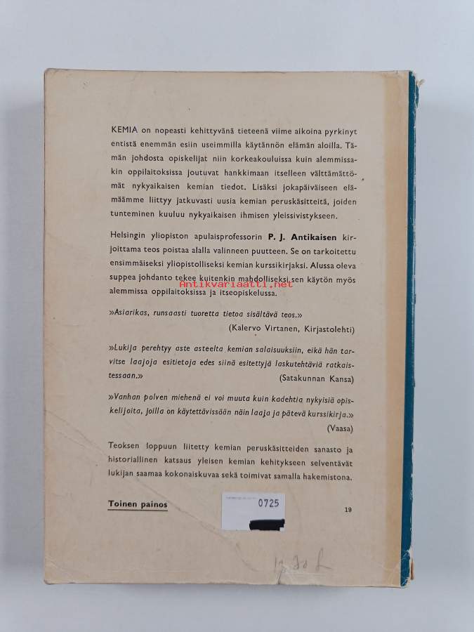 Tyydyttävä. Pientä tahraisuutta, pientä taitejälkeä, takana vanha hintalappu, selkämyksessä hieman vinoutta, selkämyksessä lukutaittumaa. kannet puoliksi irronneet