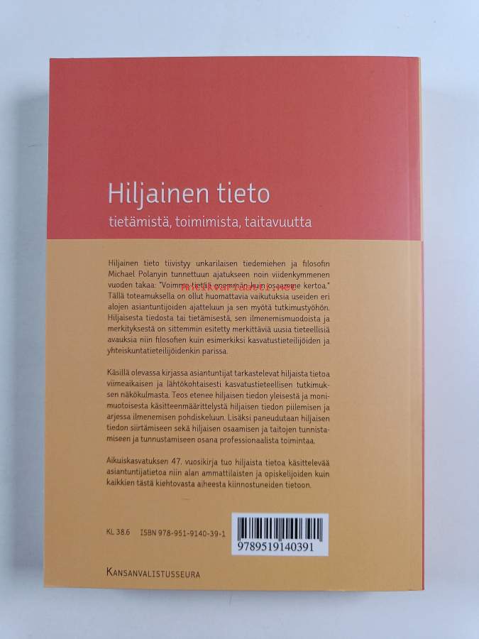 Muu(t) tekijä(t): Anneli Kajanto, Jussi Onnismaa ym.Sarja: Aikuiskasvatuksen vuosikirja 47Asiasanat: työyhteisöt, tieto, hoitotyö, monikulttuurisuus, opettajat, oppiminen, organisaatiot, ammattitaito, vapaa sivistystyö, osaaminen, kasvatustiede, aikuiskasvatus, intuitio, organisaatiokulttuuri, asiantuntijuus, työssäoppiminen, hiljainen tieto, opetussuunnitelmat, opettajankoulutus, asiantuntijat, opettajuus, ikääntyvät työntekijät, mentorointi, opetustilanne, oppimiskäsitykset, tunnistaminen, tietämyksenhallinta, näyttötutkinnot, ikäjohtaminen, kokemustieto, jakaminen, professionalismi, Learning, tyst kunskap, kollektiivinen muisti, piilo-opetussuunnitelmat, knowledge, knowledge management, tacit knowledge, specialists, osaamisen siirto, know how