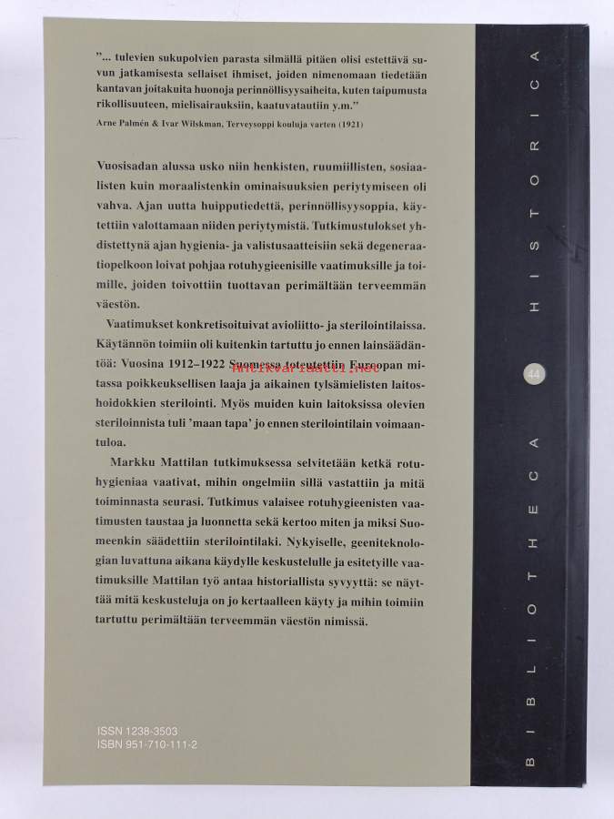 Merkinnät: omistajamerkintäSarja: Bibliotheca historica 44Asiasanat: historia, sosiaalihistoria, lääketiede, väitöskirjat, eugeniikka, rodut, teoriat, vammaisuus, kehitysvammahuolto, biologinen antropologia, väestöpolitiikka, antropologia, perinnöllisyystiede, mielisairaanhoito, sterilointi (lääketieteellinen toimenpide)