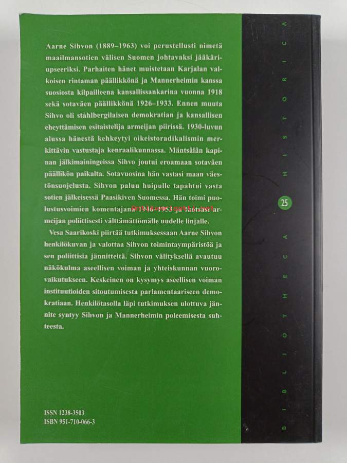 Koko nimi: Keskustajääkäri Aarne Sihvo : Demokraatti ja eheyttäjä murrosaikojen asevoimissa : Näkökulma aseellisen voiman ja yhteiskunnan vuorovaikutukseen itsenäistymisen murroksesta paasikiviläiseen toiseen tasavaltaanSarja: Bibliotheca historica 25Asiasanat: elämäkerrat