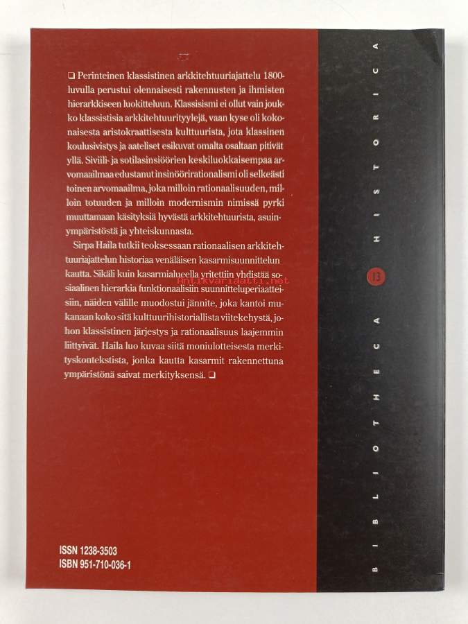 Sarja: Bibliotheca historica 13Alkuteos: Russian rationalism : military architecture of the 1910s as a social issueAsiasanat: historia, arkkitehtuuri, yhteisöt, sotilasalueet, rationaalisuus, varuskunnat, kasarmit, arkitektur, 1910-luku, gemenskaper, rationalitet, kaserner, garnisoner, militärområden, 1919-talet