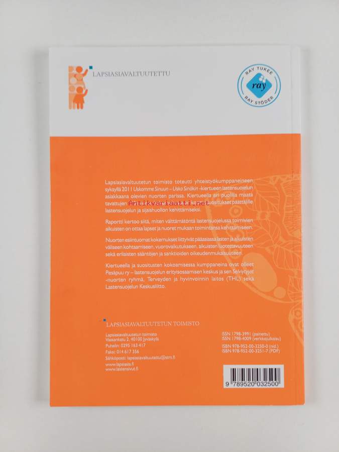 Muu(t) tekijä(t): Mikko Oranen, Johanna Barkman ym.Sarja: Lapsiasiavaltuutetun toimiston julkaisuja 2012:6Asiasanat: asiakkaat, nuoret, lapsuus, kokemukset, lastensuojelu, selviytyminen, hyvinvointi, lapsen asema, oikeudet, mielipiteet, perusoikeudet, lapsityö, sijaishuolto, lapsipolitiikka, lapset (ikäryhmät), lasten oikeudet, lapsiasiavaltuutetut
