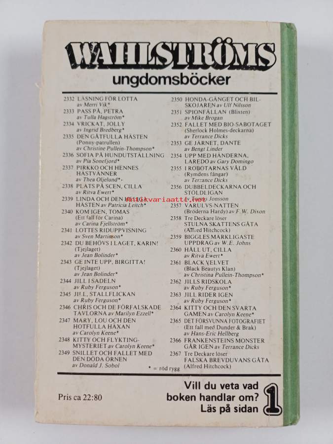 Muu(t) tekijä(t): Lena FridellMerkinnät: omistajamerkintäSarja: B. WAHLSTRÖMS UNGDOMSBÖCKER 2030/2031; BRÖDERNA HARDY 2030/2031Alkuteos: THE FLICKERING TORCH MYSTERY