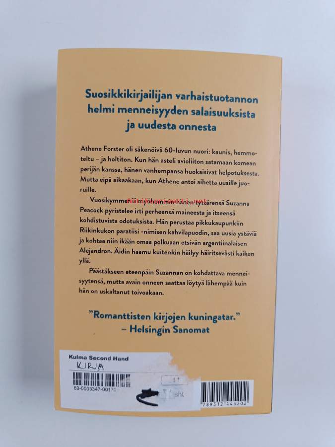 Alkuteos: Peacock EmporiumAsiasanat: ihmissuhteet, rakkaus, koskettava, Viihdyttävä, feelgood, kahvila, sydäntälämmittävä, sympaattinen, menestyskirjailijat