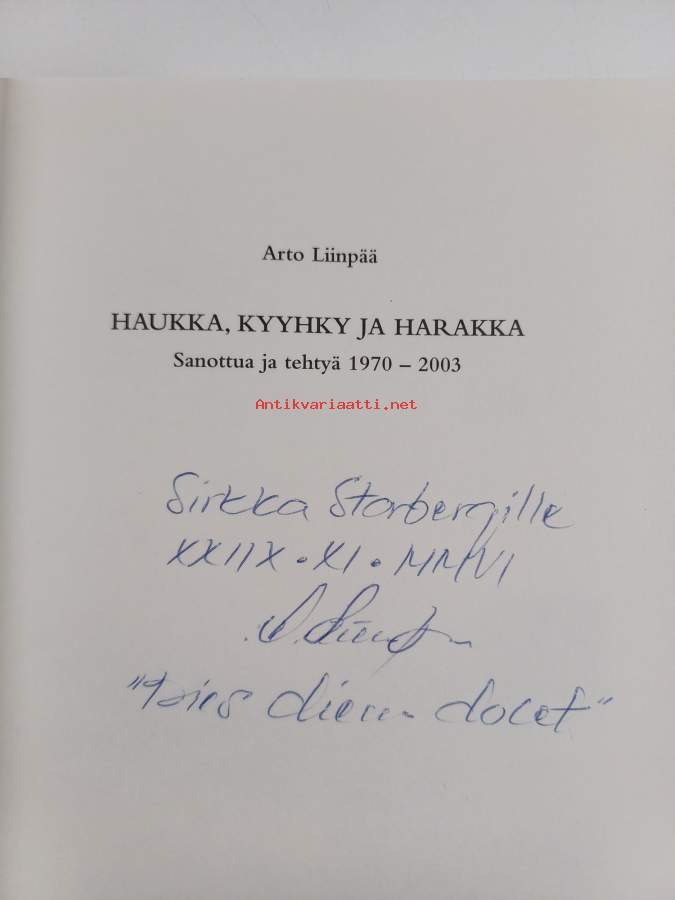 Haukka, kyyhky ja harakka : sanottua ja tehtyä 1970-2003 (signeerattu, tekijän omiste)