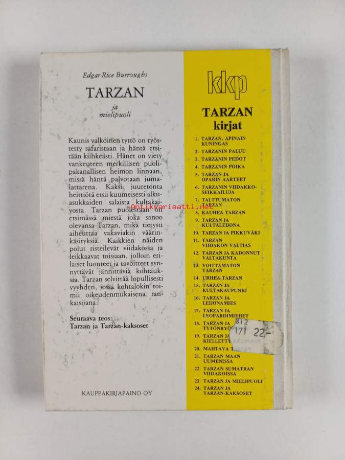 Muu(t) tekijä(t): Jaakko V. TapioSarja: Tarzan-kirjat 23Alkuteos: Tarzan and the madmanAsiasanat: jännitys, sarjakirjat, seikkailu, viidakot, nuortenromaanit, seikkailukirjat, viidakkoseikkailut
