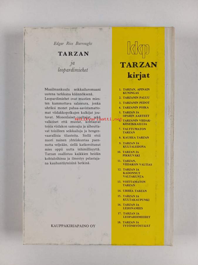Muu(t) tekijä(t): Jaakko V. Tapio, Kalevi LintulaSarja: Tarzan-kirjat 17Alkuteos: Tarzan and the leopard menAsiasanat: afrikka, viidakot