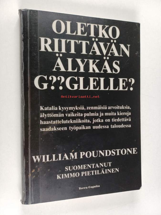 Koko nimi: Oletko riittävän älykäs Googlelle : katalia kysymyksiä, zenmäisiä arvoituksia, älyttömän vaikeita pulmia ja muita kieroja haastattelutekniikoita, jotka on tiedettävä saadakseen työpaikan uudessa taloudessaMuu(t) tekijä(t): Kimmo PietiläinenAlkuteos: Are you smart enough to work at GoogleAsiasanat: menestyminen, työnhaku, Google, työhaastattelut
