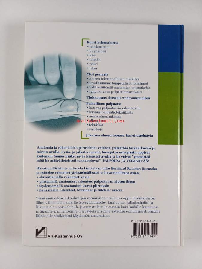 Muu(t) tekijä(t): Karin StåhlAlkuteos: Anatomie in vivo : palpieren & verstehen.Asiasanat: fysioterapia, kädet, anatomia, tuki- ja liikuntaelimet, nivelet, jalat, ruumiinosat, hartiat, lonkka, lantio, polvet, raajat, Anatomy, olkapäät, kyynärpäät, palpation, palpaatio