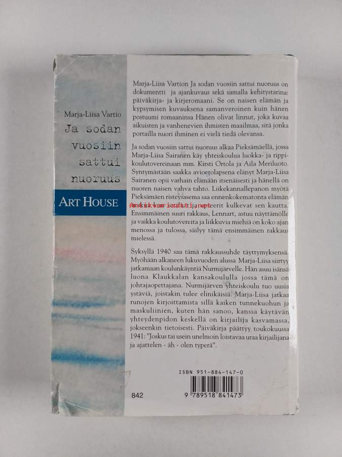 Tyydyttävä. Tarkempi kuntoluokka: K2+ ; Jonkin verran tahraisuutta kansissa, hieman kulumaa, selkämyksessä hieman vinoutta. Kansipaperin kunto: kulumaa/pienehköjä repeämiä & tahraisuutta
