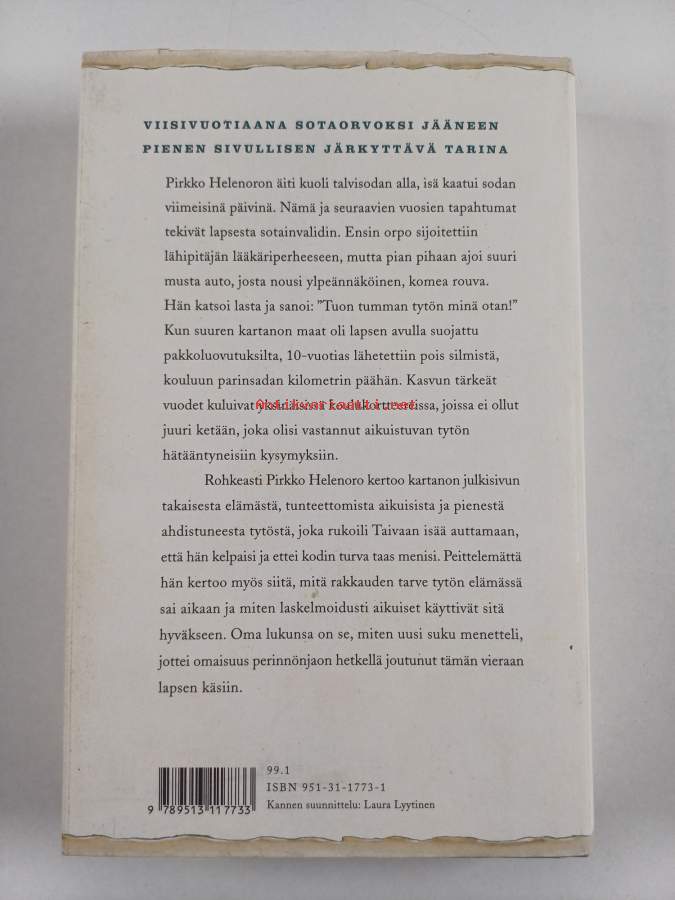 Hyvä. Tarkempi kuntoluokka: K3+ ; Hieman kolhua selkämyksen päissä. Kansipaperin kunto: pienoista kulumaa reunoilla, muuten erinomainen