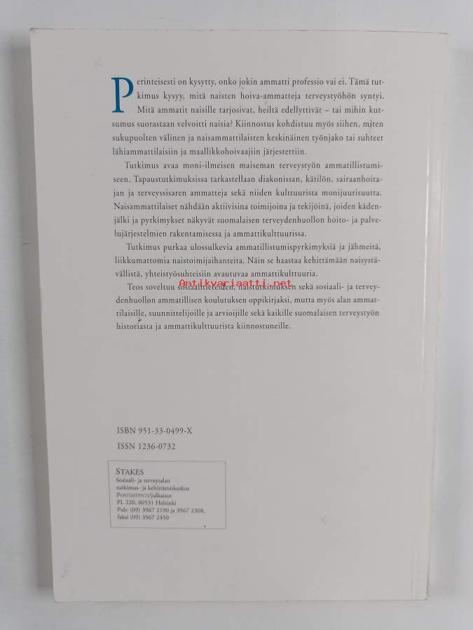 Sarja: Tutkimuksia / Sosiaali- ja terveysalan tutkimus- ja kehittämiskeskus 88Asiasanat: naiset, väitöskirjat, hoitotyö, professiot, hoitohenkilöstö, terveydenhuolto, ammatit, hoivatyö, ammatillistuminen, ammattikulttuuri