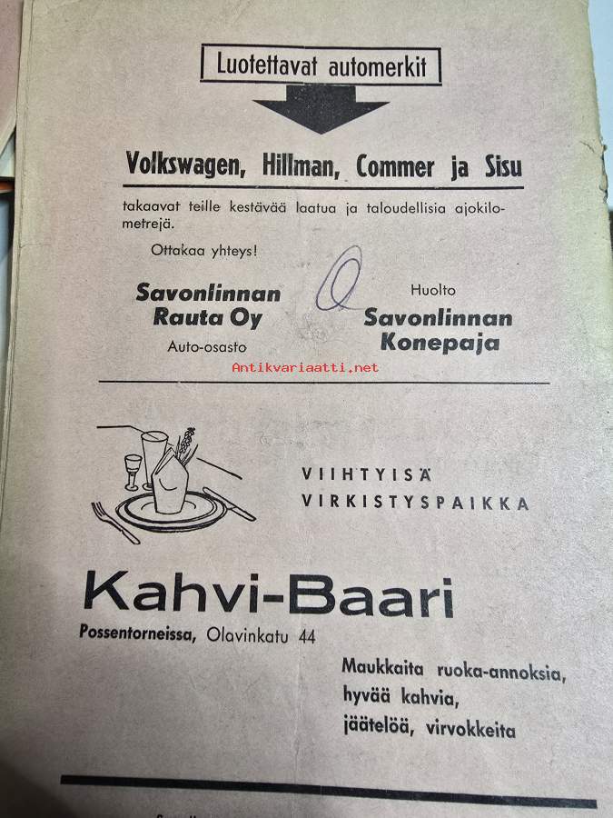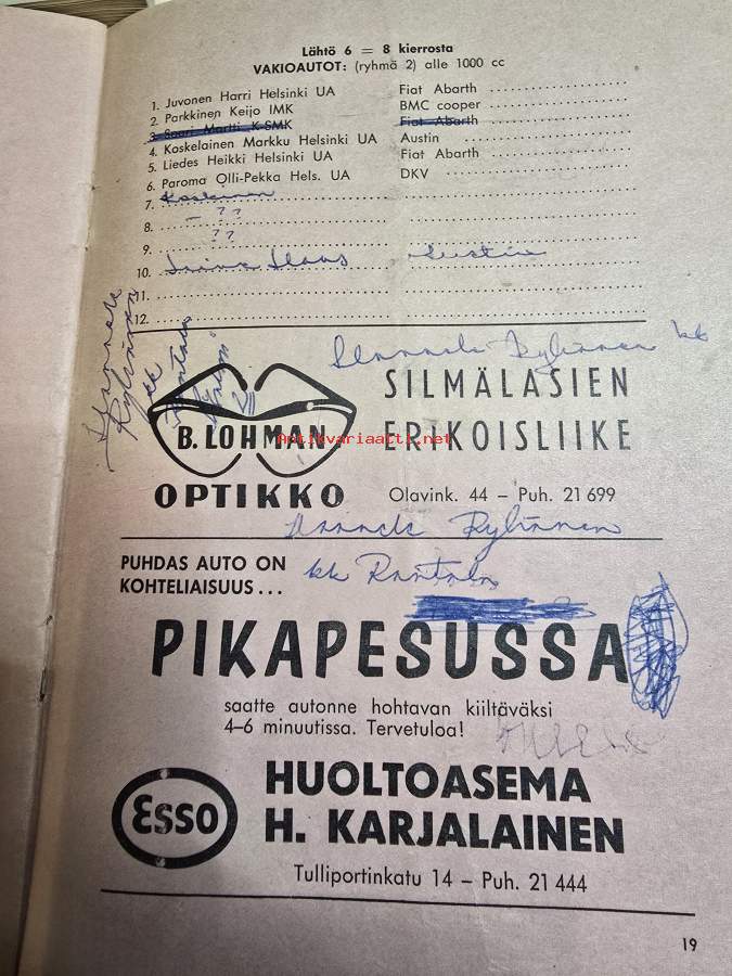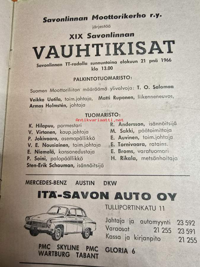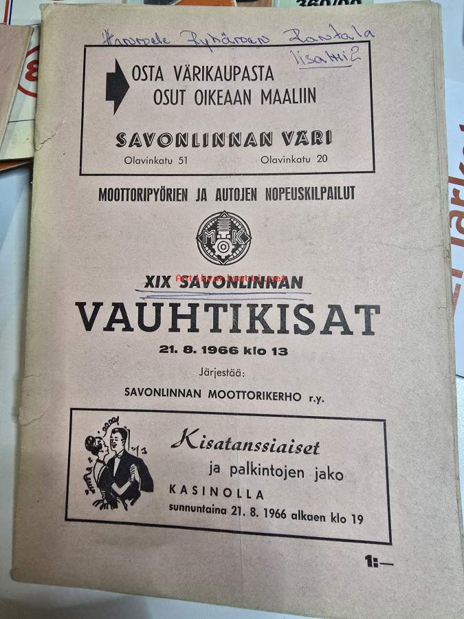 XIX Savonlinnan vauhtikisat 21,8, 1966 käsiohjelma.