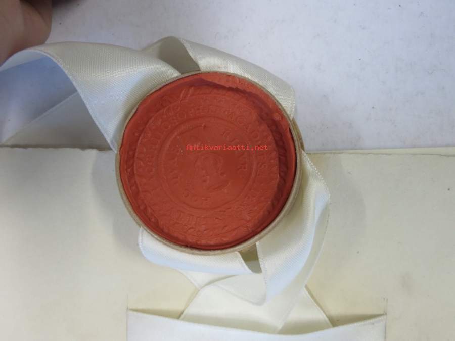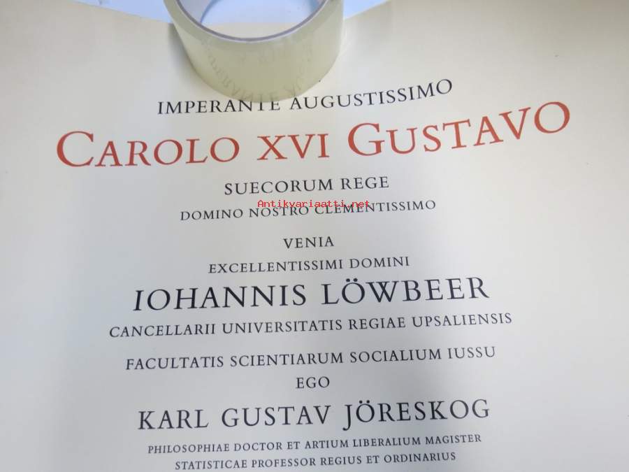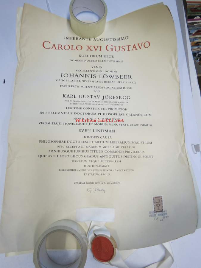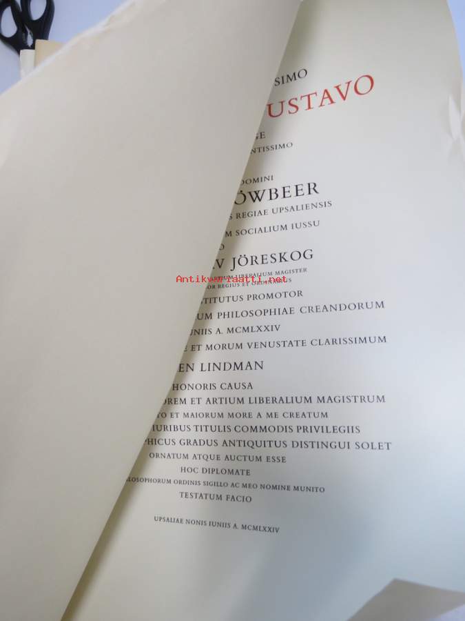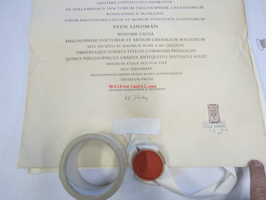 Upsalan yliopiston kunniatohtorin diplomi 1974 - Sven Lindman (Åbo akademi valtiopin professorille myönnetty), tekstissä myös maininta filosofian tohtorin arvosta ym