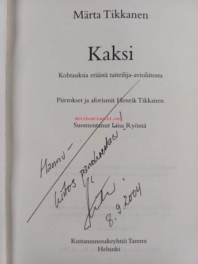 Kaksi : kohtauksia eräästä taiteilija-avioliitosta (signeerattu, tekijän omiste)