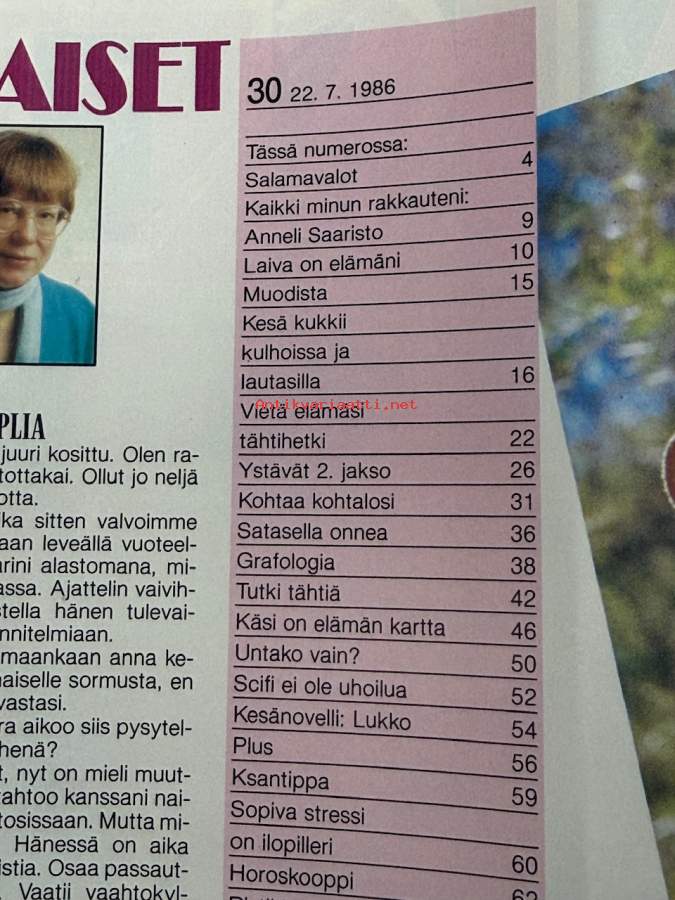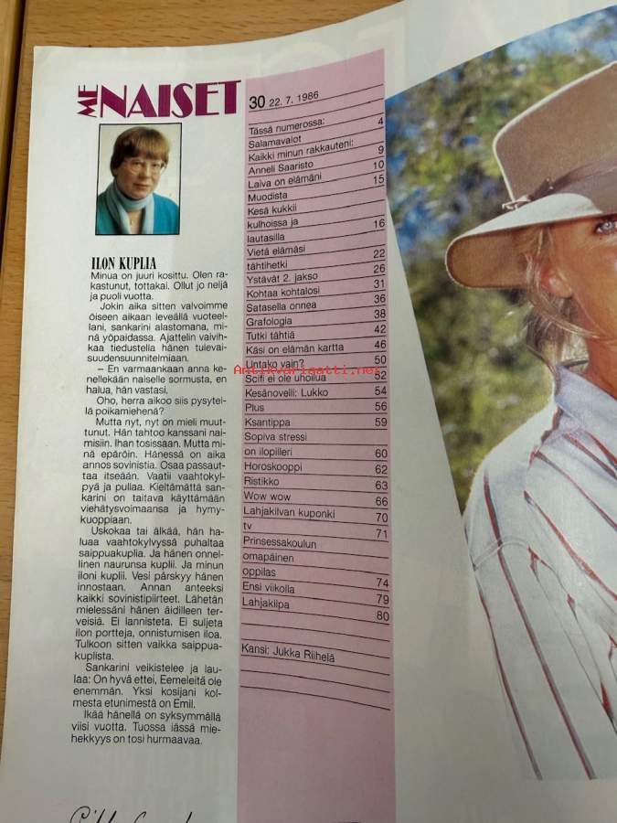 Me Naiset 1986 nr 30, 22 sivua mystiikkaa, Gustav Myrsten - Viking line, Johanna Sinisalo, Anneli Saaristo