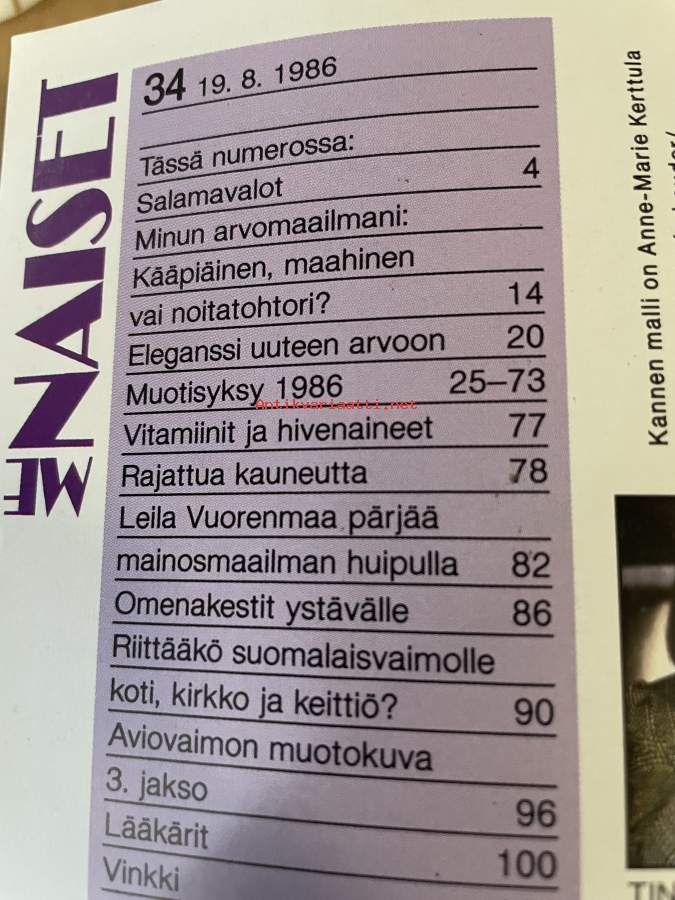 Me Naiset 1986 nr 34 (19.8.), Syysmuoti 86, Nastassja Kinski, Emmanuelle Khanh, Pierre Cardin, Leila Vuorenmaa