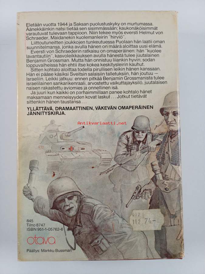 Hyvä. Hieman kolhua reunoilla ja kulmissa, selkämyksessä vinoutta, takana vanha hintalappu. Kansipaperin kunto: joitain repeämiä/kulumaa