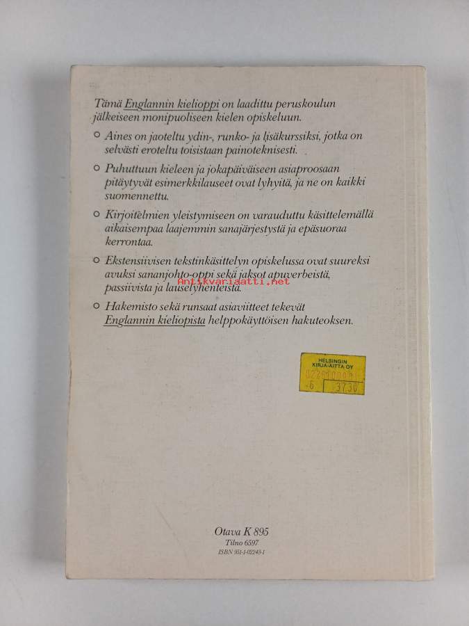 Hyvä. Tarkempi kuntoluokka: K3- ; Pientä kulumaa kansissa, hieman tahraisuutta reunoilla, pienoista repeämää selkämyksen alakulmassa, selkämyksessä hieman vinoutta, takana vanha hintalappu
