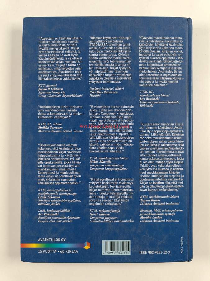 Asiasanat: markkinointi, mainonta, tutkimus, yritykset, kilpailukyky, myyntityö, myynti, myynninedistäminen, mielikuvat, vaikuttaminen, liikesuhteet, asiakaspalvelu, markkinointiviestintä, hinnat, hinnoittelu, suoramarkkinointi, henkilöstö, tuotekehitys, saatavuus, jakelu, tavaramerkit, toimintaympäristö, logistiikka, merkkitavarat, suhdetoiminta, suhdemarkkinointi, tuotteet, asiakkuus, tarpeet, liiketoimintaympäristö, markkinat (taloustiede), kilpailu (toiminta), segmentointi, asiakassegmentointi