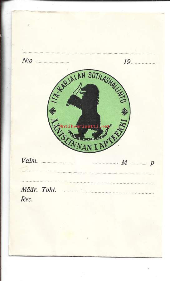 Itä-Karjalan Sotilashallinto / Äänislinnan I apteekkki resepti signatuuri reseptipussi 13x8 cm