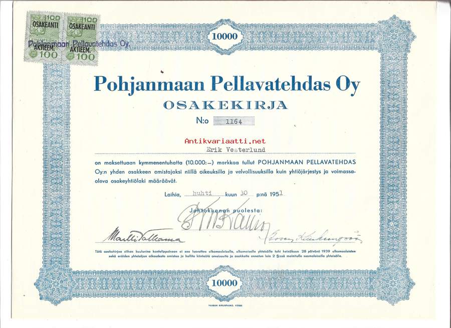 Pohjanmaan Pellavatehdas Oy, Laihia 1952 merkitty osakekirja
