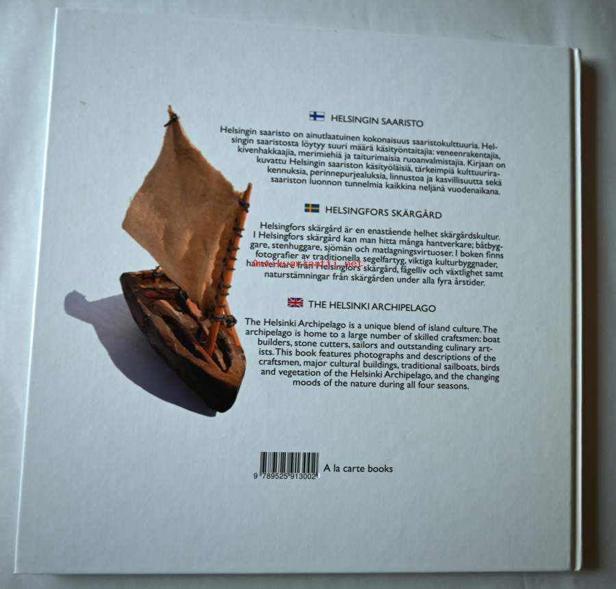 Helsingin saaristo on ainutlaatuinen kokonaisuus saaristokulttuuria. Helsingin saaristosta löytyy suuri määrä käsityöntaitajia veneenrakentajista, kivenhakkaajista ja merimiehistä aina taiturimaisiin ruoan valmistajiin. Helsingin Saaaristo -kirjaan on kuvattu saariston käsityöläisiä, tärkeimpiä kulttuurirakennuksia, perinnepurjealuksia, linnustoa, kasvillisuutta ja pursiseurojen ravintoloiden valmistamia ruokia sekä saariston luonnon tunnelmia