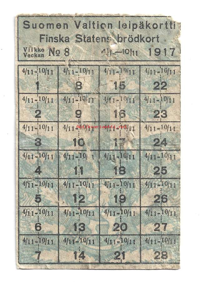 Suomen valtion leipäkortti 1917 viikko nr 8
