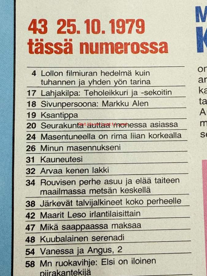 Me Naiset 1979 nr 43, Gina Lollobrigida, Sivun persoona Markku Alen, Käte Nyberg Skandinavian kaunein, Tuulikki Kannisto, Väinö Rouvinen ja Meeri Torvinen