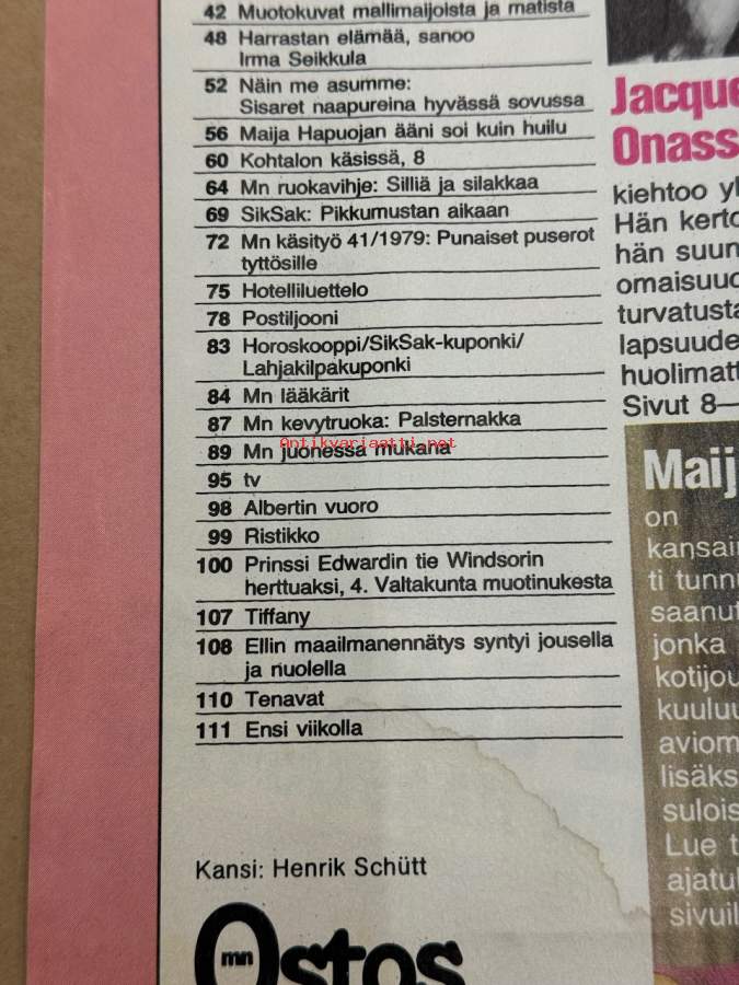 Me Naiset 1979 nr 41, Armi Ratian viimeinen haastattelu, Maija Hapuoja, Näin me asumme - Marjut ja Seppo Mykrä ja Pirkko ja Jukka Silaste