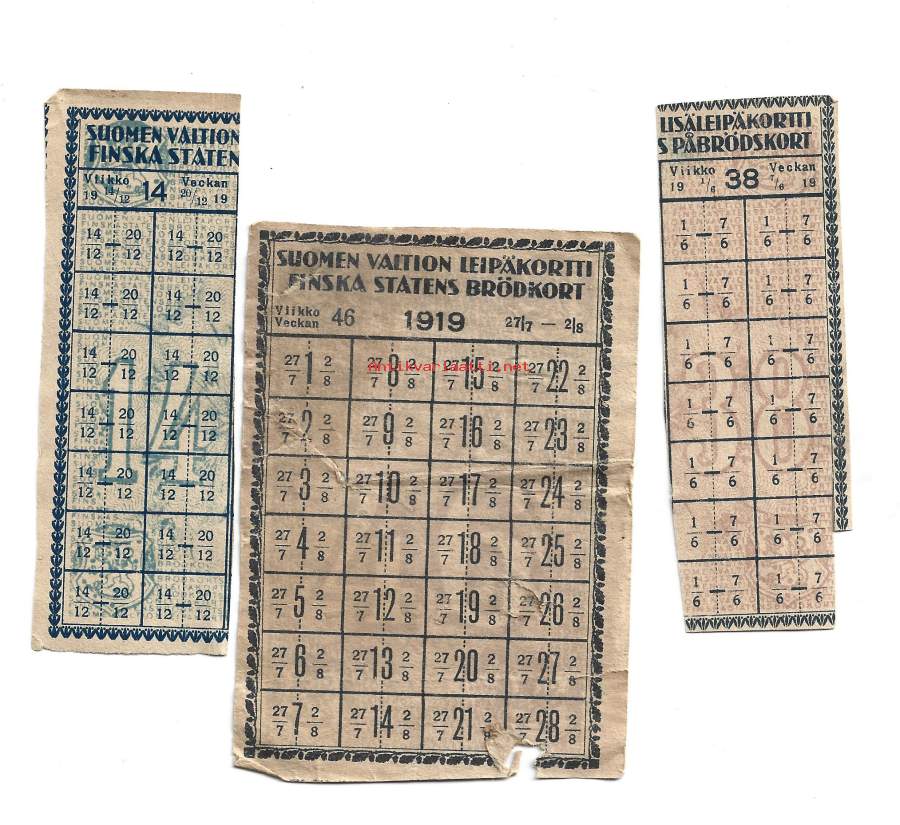 Suomen valtion leipäkortti ja lisäleipäkortti 1919 satunnaiset viikot erä