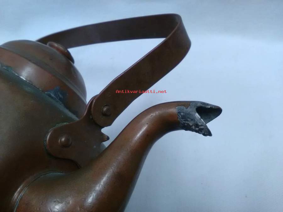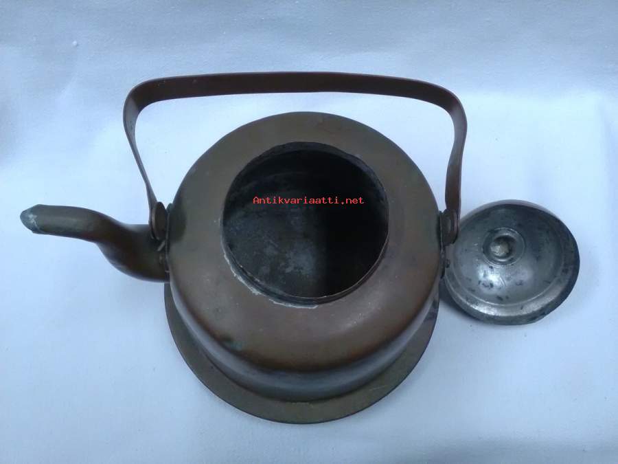 korkeus pohjasta sangan yläosaan 19cm, pohjan halkaisija ulkomitta 13,5cm, paino 559g, patinoitunut, luonnollisesti käytön jälkiä, pannu hellan renkaisiin(kuparipannu 5)
