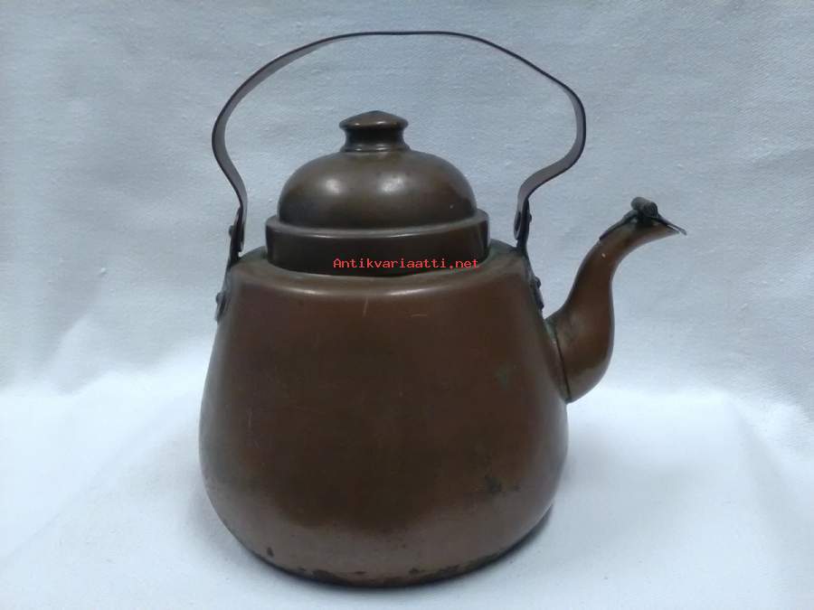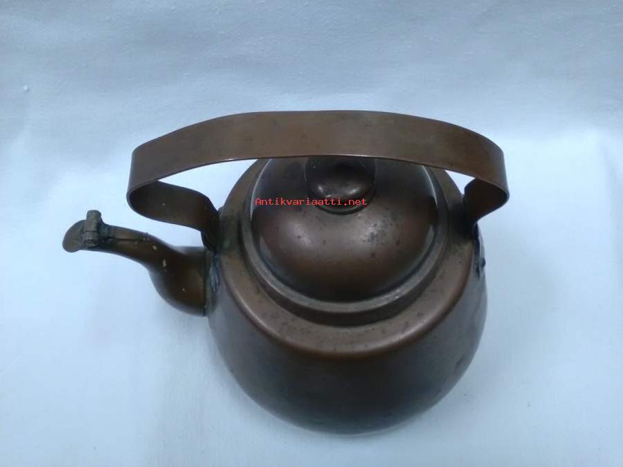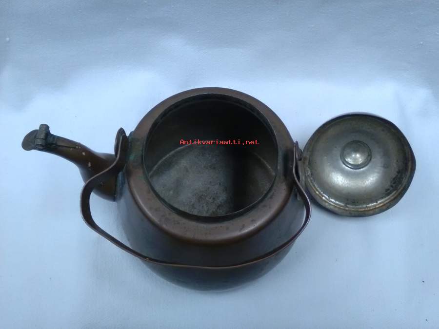 korkeus pohjasta sangan yläosaan 18,5cm, pohjan halkaisija ulkomitta 12,5cm, torakkaläppä, paino 493g, patinoitunut, kahva on vino, pohja epätasainen, mutta pannu on kaunis(kuparipannu 6)
