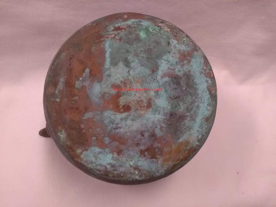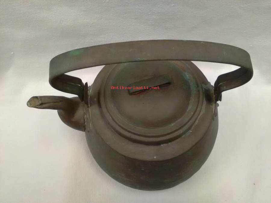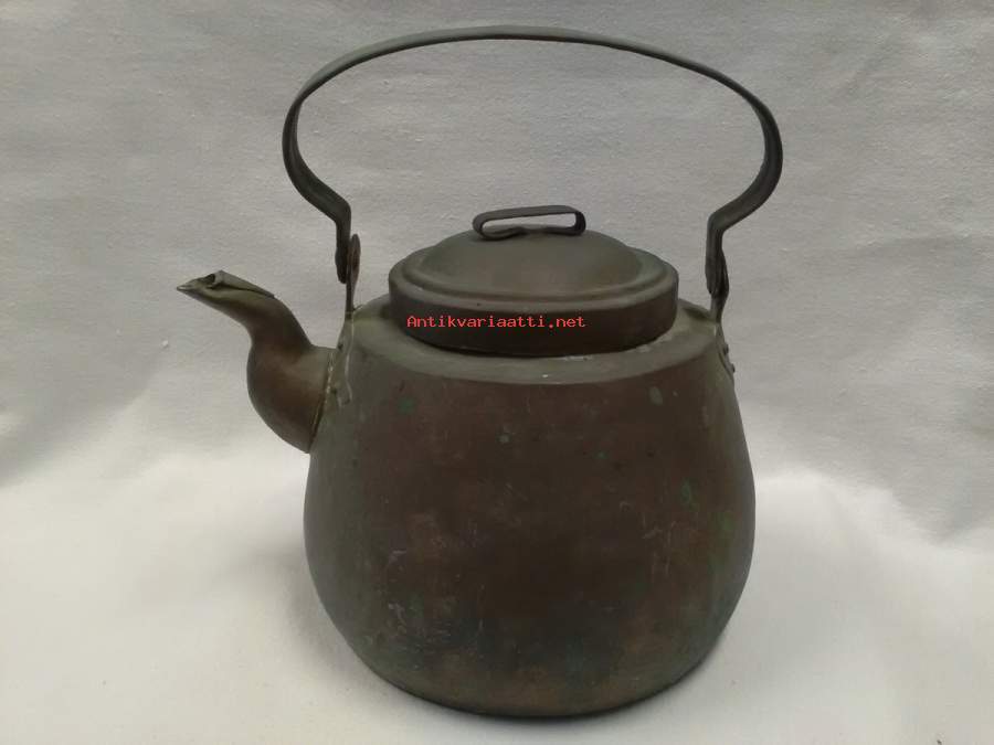 korkeus pohjasta sangan yläosaan 25,5cm, pohjan halkaisija ulkomitta 16cm, paino 681g, patinoitunut, torakkaläppä kadonnut, luonnollisesti käytön jälkiä(kuparipannu 1)