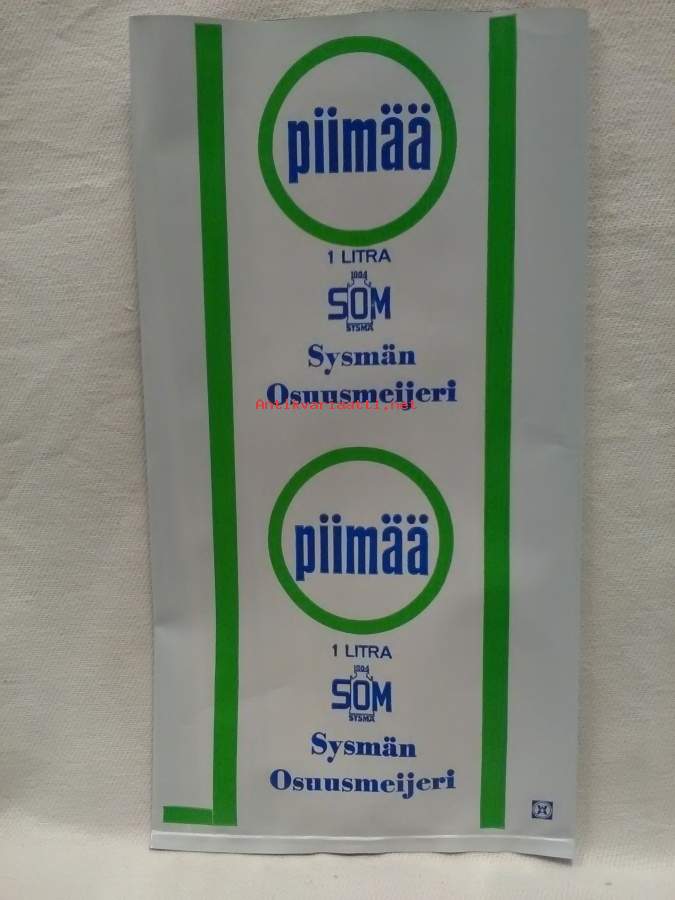 Piimää , muovipussi avattu tuotepakkaus 1960-70 - Maitoa alettiin pakata muovipusseihin vuonna1967, tiettävästi ensimmäisenä Valion Turun meijerissä.