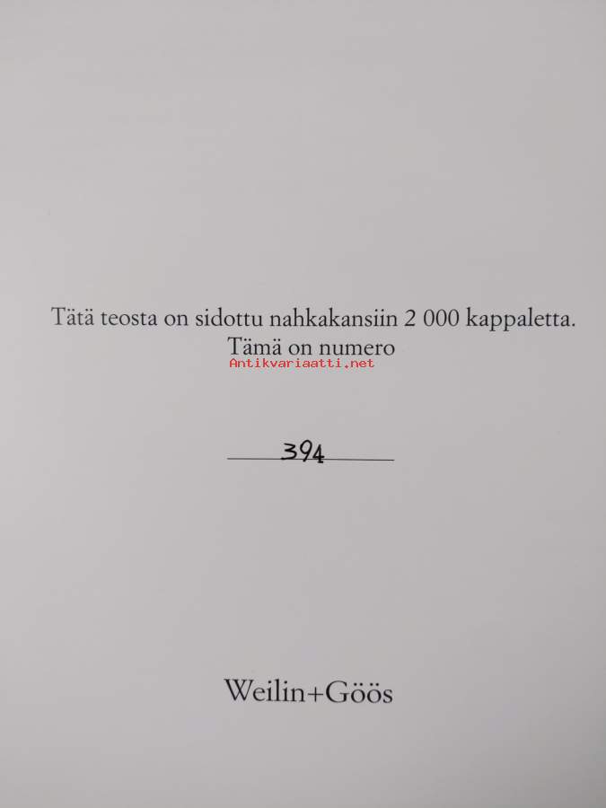 Hyvä. Tarkempi kuntoluokka: K3+ ; Pienoista kolhua kulmissa, pienoista kulumaa kansissa. kirja kotelossa jossa pienoista kulumaa, numeroitu 394/2000