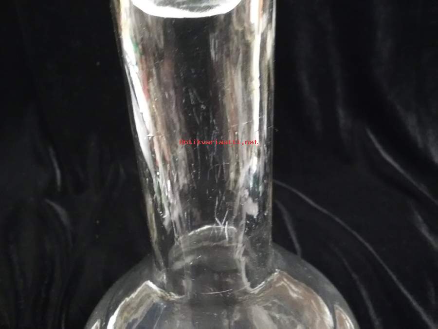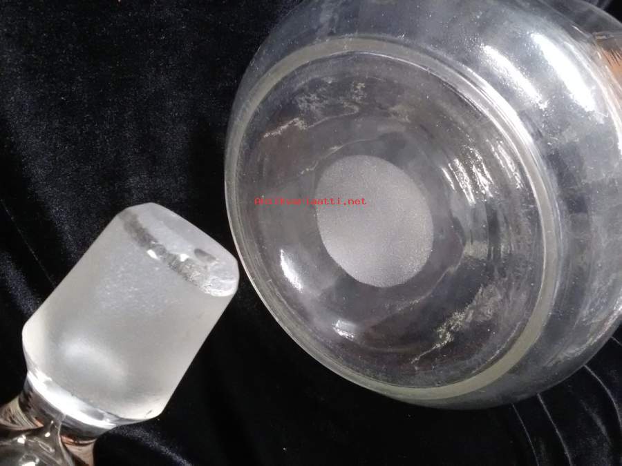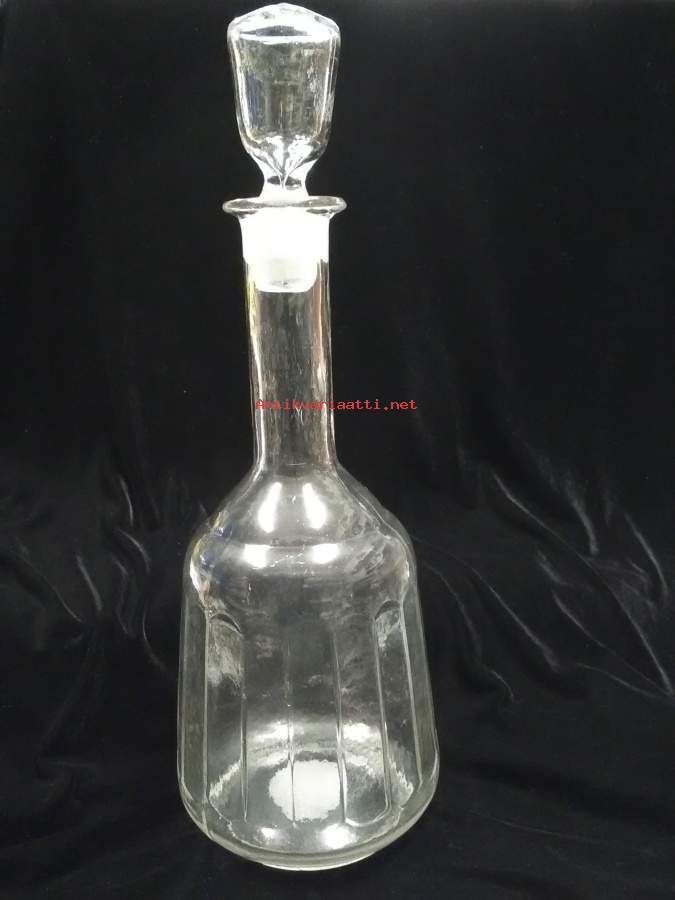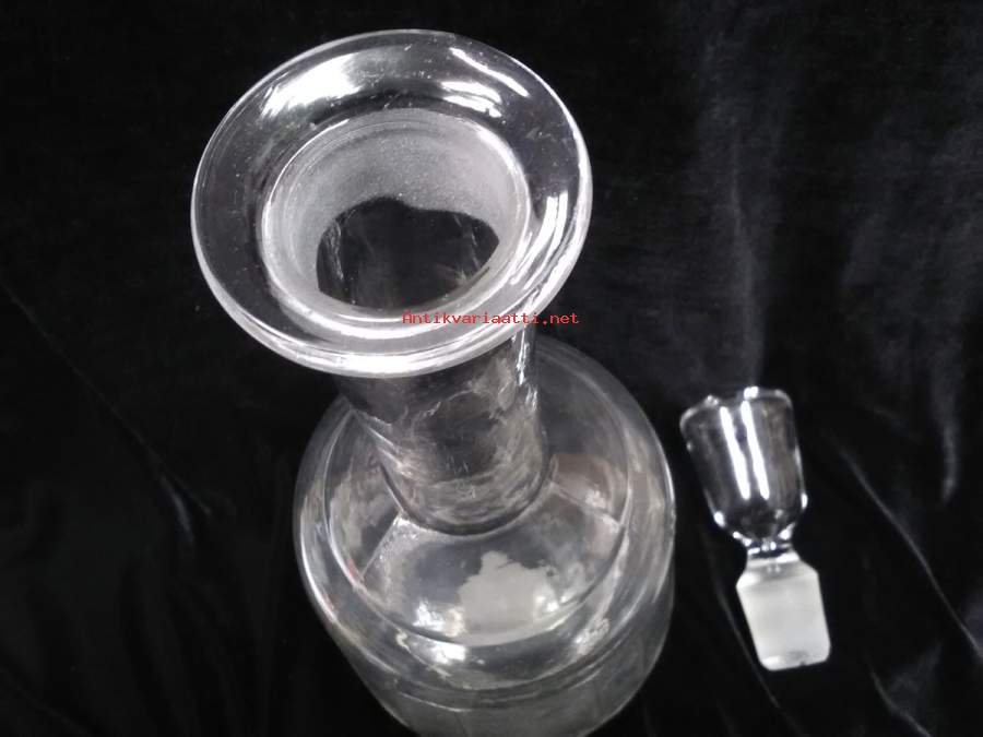 Korkeus korkin kanssa n.40,5cm, suuaukko ja korkin alaosa hiottu, molemmissa käytön jälkiä, korkin alaosassa 0,3x0,5cm iskemä, paino 1128g, pohjan halkaisija n.11cm, karahvin alaosa hiukan harmahtava, silti kaunis karahvi