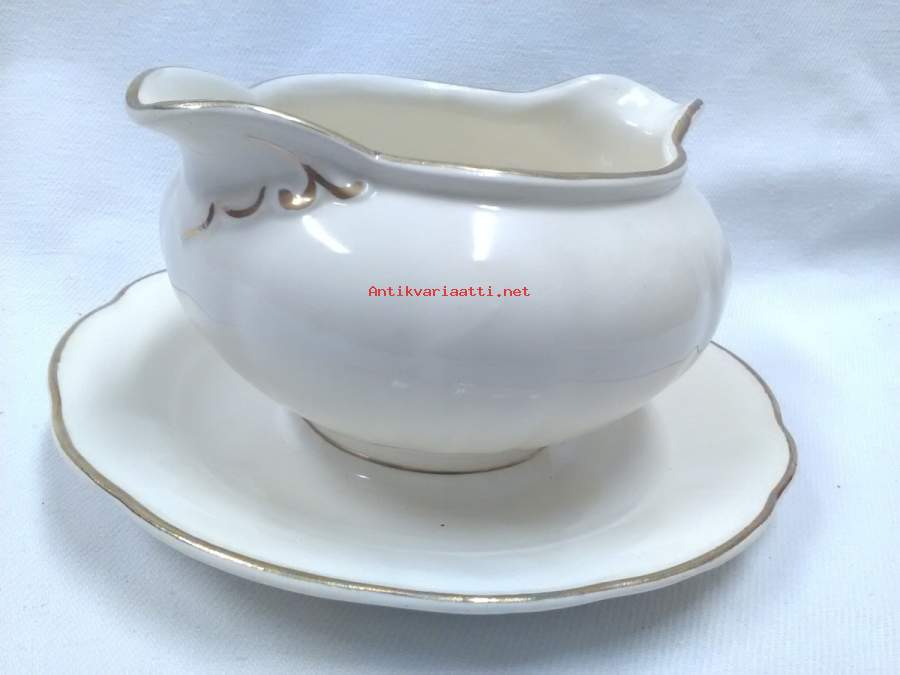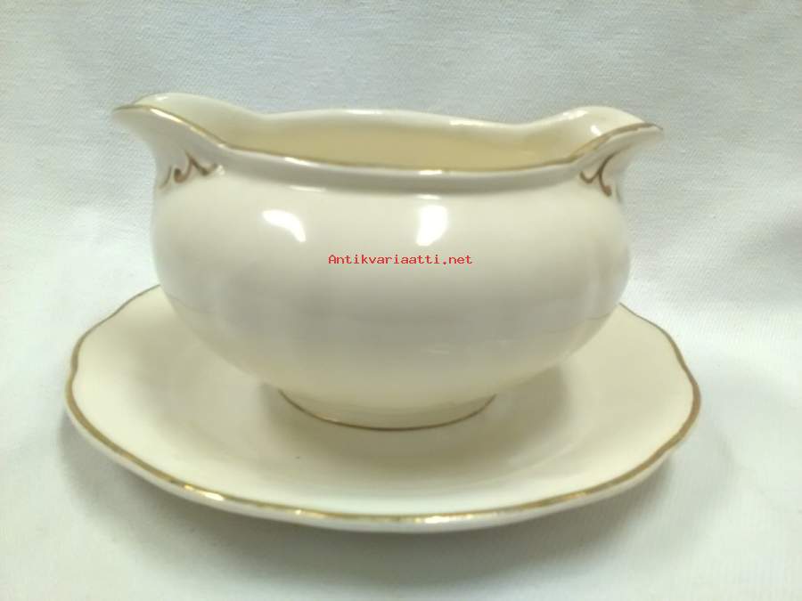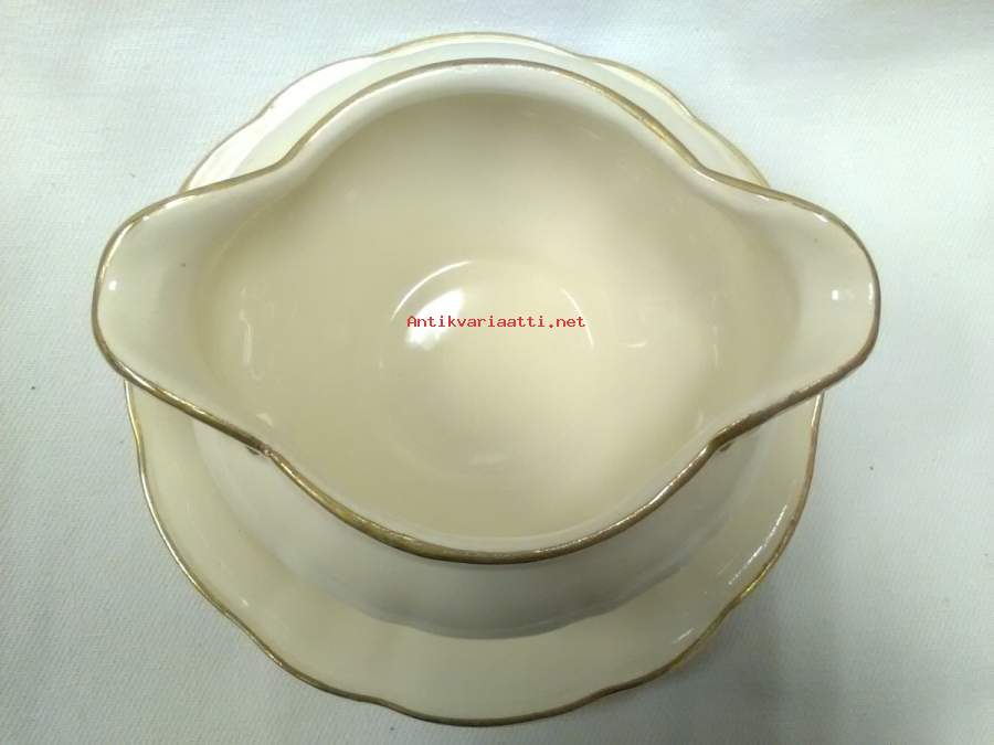 kastikeastia, kermanvalkoinen, korkeus 9cm, kiinteän alaosan halkaisija 19cm, kultauksissa hyvin vähäistä kulumaa
