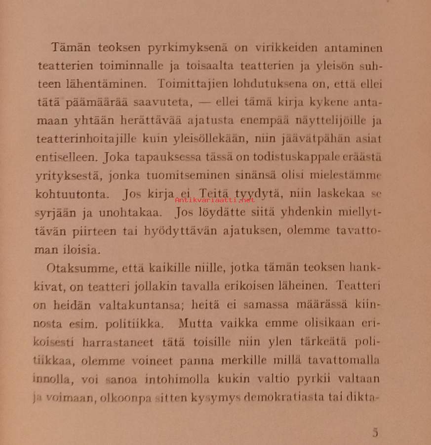 Kirja esittelee Suomen teattereiden toimintaa 1930‑luvun lopulla - historiallinen katsaus suomalisen teatterin kehitykseen ja sisältöön. Kirjoittajina mm. Mika Waltari, Erkki Kivijärvi, Elsa Soini etc. Kuvitettu. Dimensiot 22 ¤ 16 cm.
