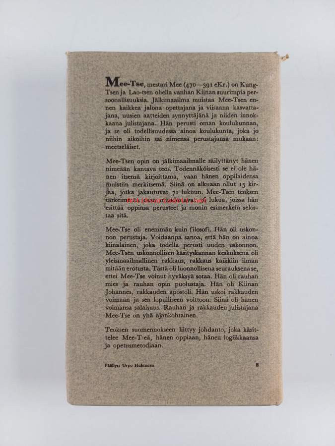 Muu(t) tekijä(t): Toivo Koskikallio, Mee-tseMerkinnät: omistajamerkintäAsiasanat: itämainen filosofia, antiikki, filosofia, käännökset, kiinankielinen kirjallisuus, uskonto ja uskonnot