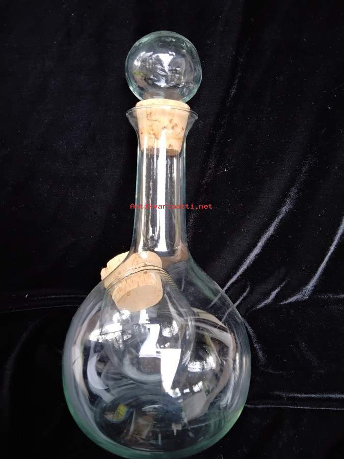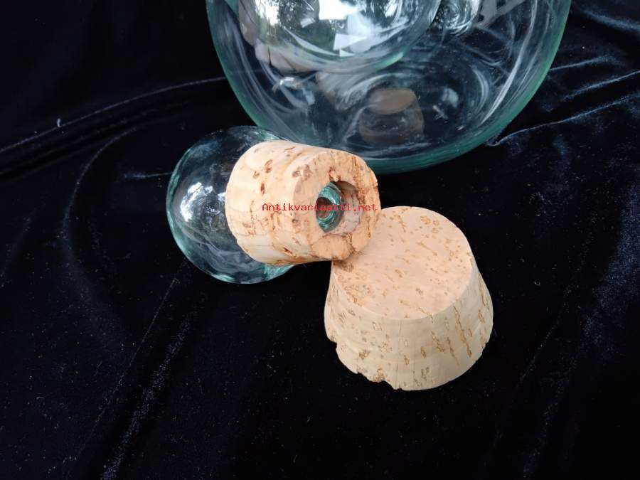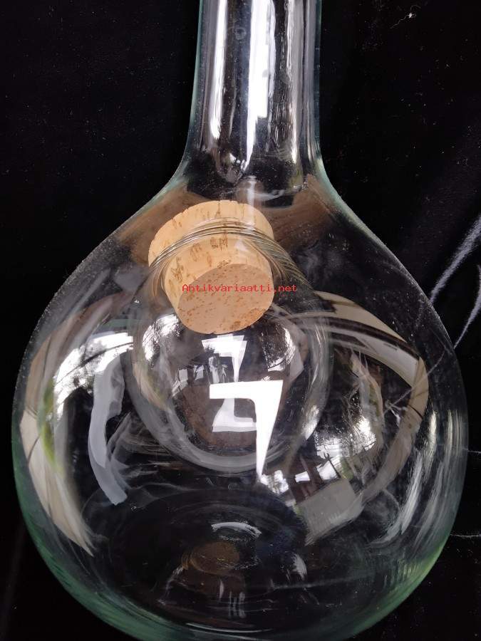 kirkas lasinen karahvi, jonka sisään on tehty korkillinen lasinen kiinteä astia esim.jäille, 1l, korkeus ilman korkkia 23cm, korkin kanssa 28cm, suuaukon halkaisija ulkomitta 5cm, toinen korkki korkkia ja lasia, toinen korkkia, korkeissa hieman kulumaa