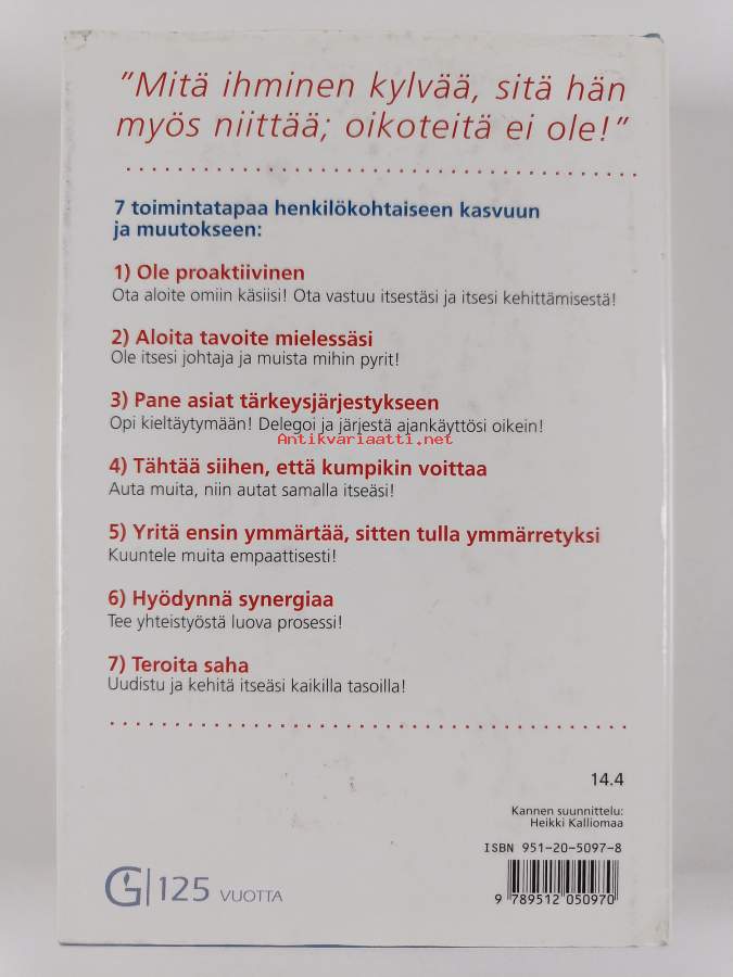 Muu(t) tekijä(t): Raimo SalminenMerkinnät: omistajamerkintäAlkuteos: The 7 habits of highly effective peopleAsiasanat: elämäntaito, menestyminen, ihmissuhteet, sosiaaliset taidot
