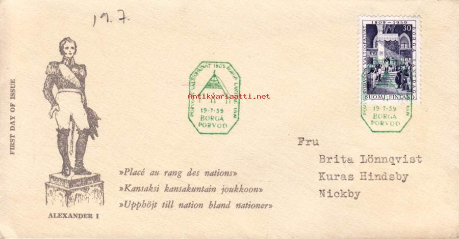 FDC Suomi (erikoisleimakuori) Porvoon valtiopäivät HUOM! leima 19.7.1959 p.o.(22.3.1959). LAPE 504.