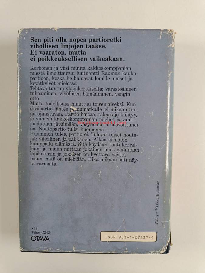 Tyydyttävä. Tarkempi kuntoluokka: K2+ ; Hieman tahraisuutta, hieman kulumaa, pientä repeämää selkämyksessä, selkämyksessä hieman vinoutta. Kansipaperin kunto: repeämiä/kulumaa / tyhjällä esilehdellä vanha hintalappu