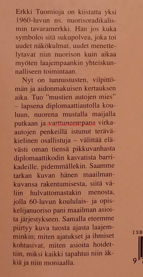 Muistelmateos on Tuomiojan omakohtainen kuvaus radikalisoitumisesta, opiskelijaliikkeestä ja 60‑luvun aatteellisesta murroksesta + katsaus Kekkosen ajan valtapolitiikkaan. Dimensiot 21 ¤ 14 cm.