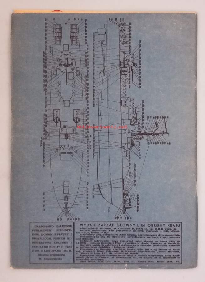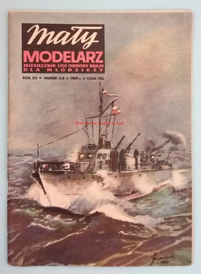 Mały Modelarz oli puolalainen nuorisolle suunnattu mallirakennuslehti ja sitä julkaisi Liga Obrony Kraju (LOK) – Puolan maanpuolustusjärjestö. Lehti sisälsi kartonkimallien rakennuskaavoja kokoamisohjeineen: laivoja, lentokoneita, panssarivaunuja, rakennuksia. Numeron koottavana mallina todennäköisetsi Puolan laivaston hävittäjä, mahdollisesti Grom‑luokka. Dimensiot 30 ¤ 21 cm. Harvinainen ja hyväkuntoisen erittäin harvinainen Mały Modelarz was a Polish model‑building magazine aimed at young readers and published by Liga Obrony Kraju (LOK), the Polish national defense organization. The magazine contained cardboard model templates with assembly instructions, including ships, aircraft, tanks, and buildings. The model included in this issue was most likely a destroyer of the Polish Navy, possibly of the Grom class. The dimensions are 30 × 21 cm.Condition grade K3+ or K4. The covers show slight fading. No tears, no markings. The template sheets are flawless and uncut