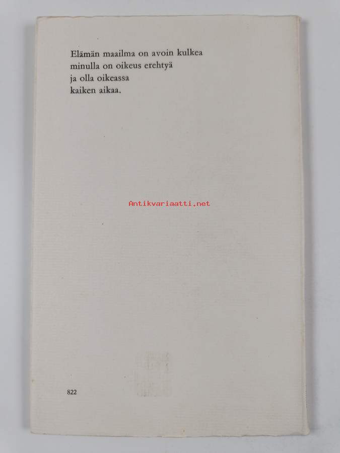 Hyvä. Tarkempi kuntoluokka: K3- ; Hieman kulumaa, pienoista nuhruisuutta kansissa, takana hintalapun jäämää. viimeisen aukeaman taitteessa pienoisa pintarepeämää