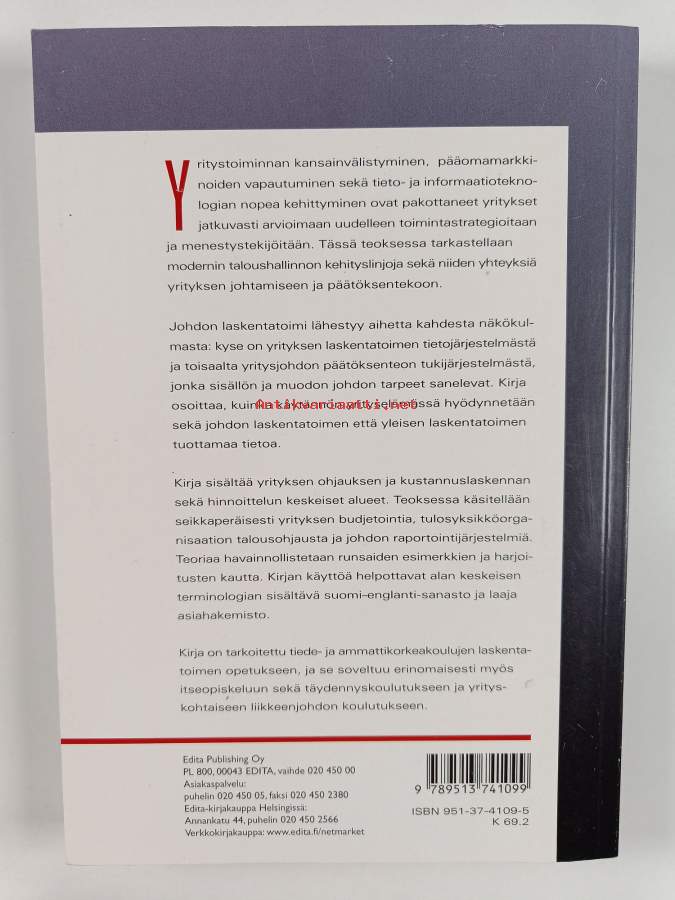 Muu(t) tekijä(t): Erkki Uusi-RauvaSarja: Business Edita; Yrityksen tuloslaskentaAsiasanat: taloussuunnittelu, yritykset, johtaminen, päätöksenteko, talous, liiketalous, laskentatoimi, budjetointi, yritysstrategiat, liikkeenjohto, hinnoittelu, kustannuslaskenta, taloushallinto, taloudellinen ohjaus, omistajaohjaus, tasapainotettu mittaristo