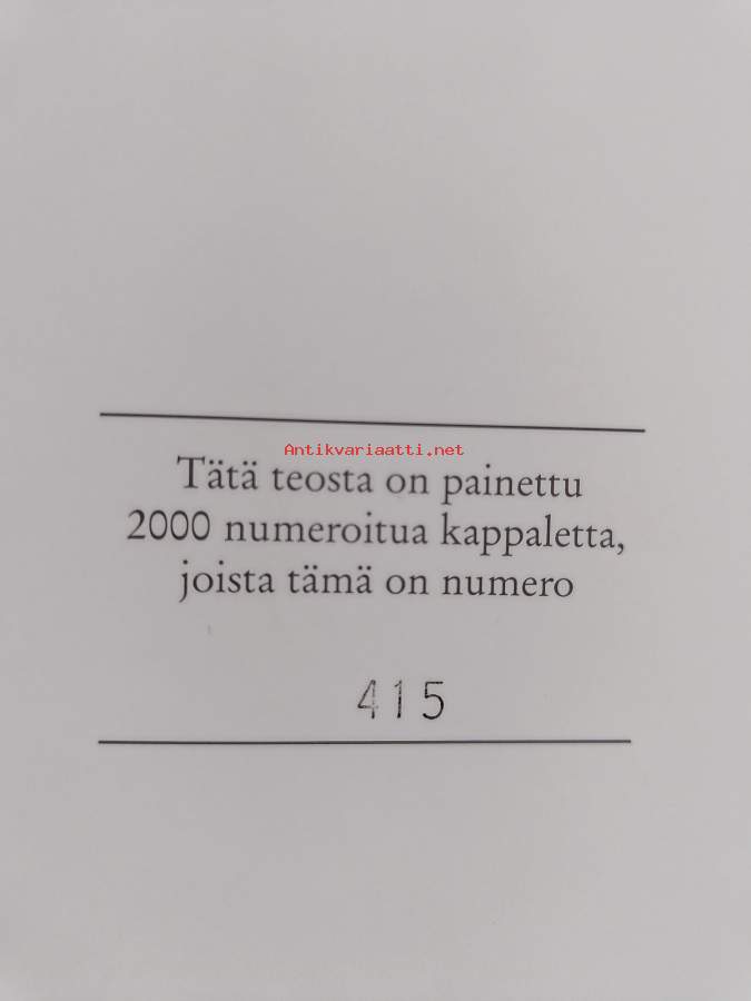 Erinomainen. Tarkempi kuntoluokka: K4- ; Pienoista kulumaa kansissa. tätä teosta on painettu 2000 kpl, joista tämä on numero 415